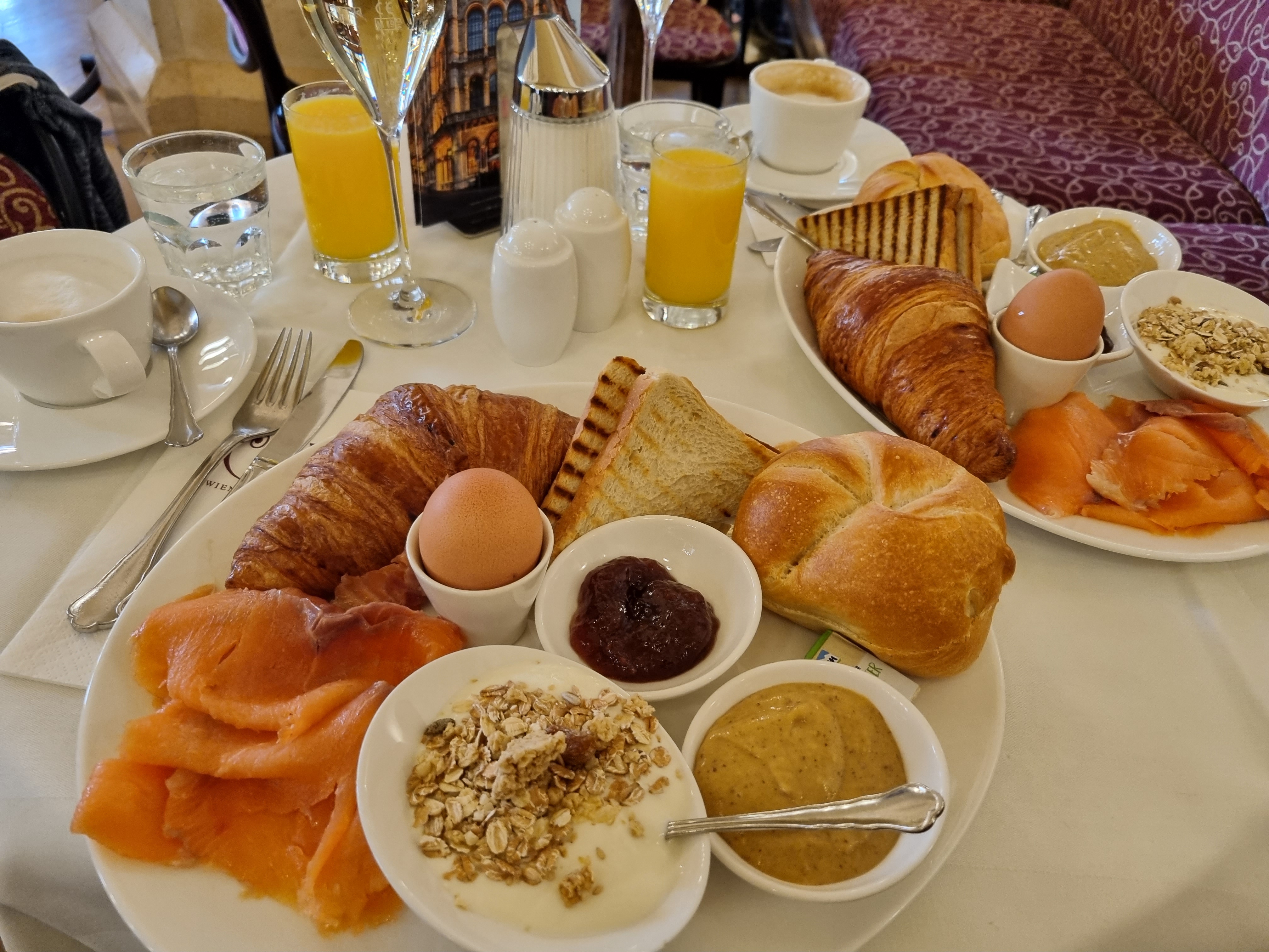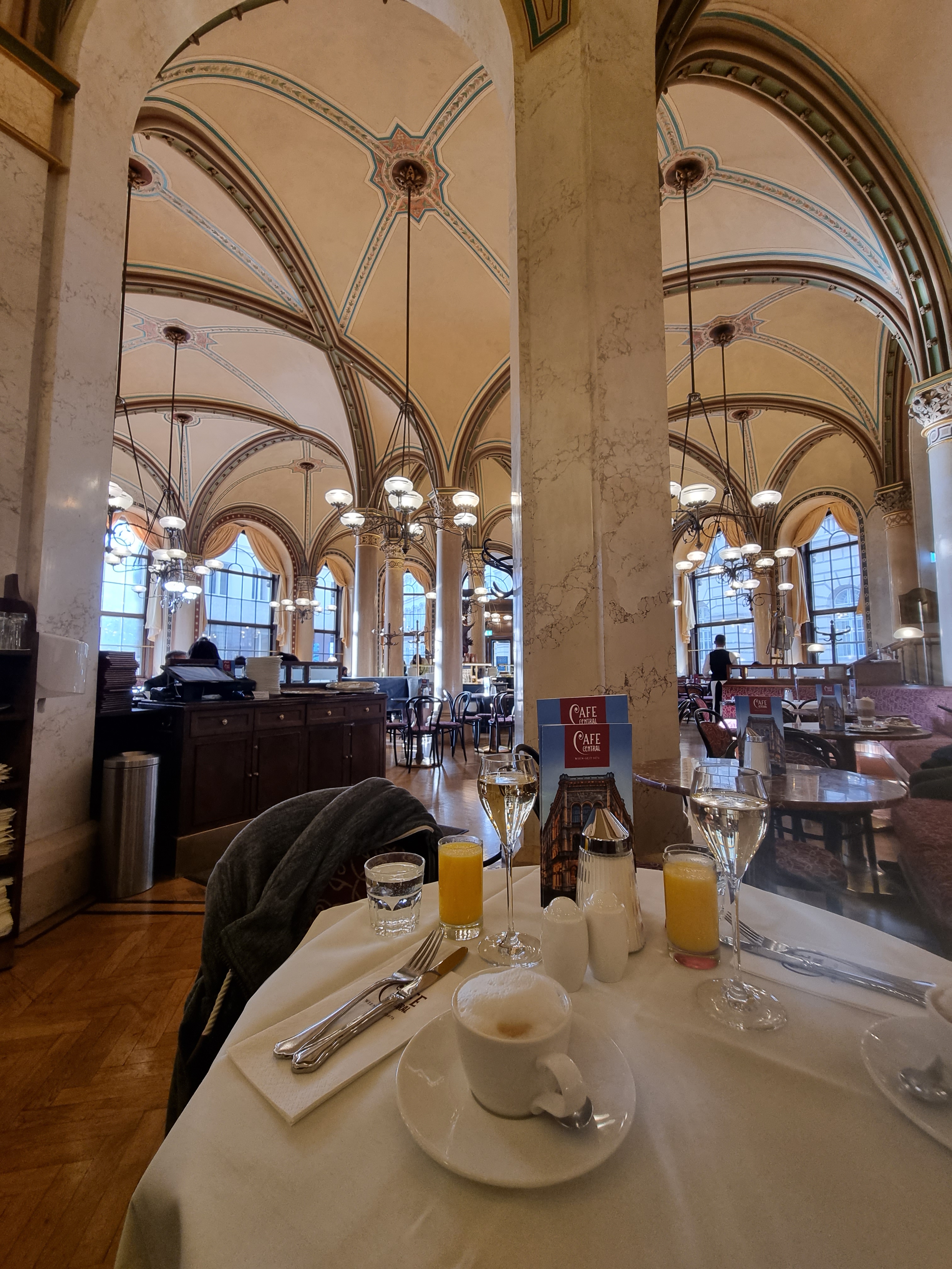 Wir haben ohne Frühstück gebucht, es gibt also wirklich genug Möglichkeiten in Wien zu frühstücken. Am Samstag sind wir ins bekannte Café Central, hier müsst ihr gleich früh kommen oder reservieren. Wir sind gleich hin als es geöffnet hat, als wird dann wieder gegangen sind hatte es schon eine lange Schlange. Das Café ist nur etwa 5 Min vom Hotel weg. Es gibt verschiedene Frühstückskombis im Angebot oder auch viele leckere Süsse Sachen, dazu noch ein schönes nostalgisches Ambiente. Wir haben uns für Sektfrühstück entschieden, wenn schon denn schon. Es war wirklich super und wir hatten eine wirklich tolle Bedienung.