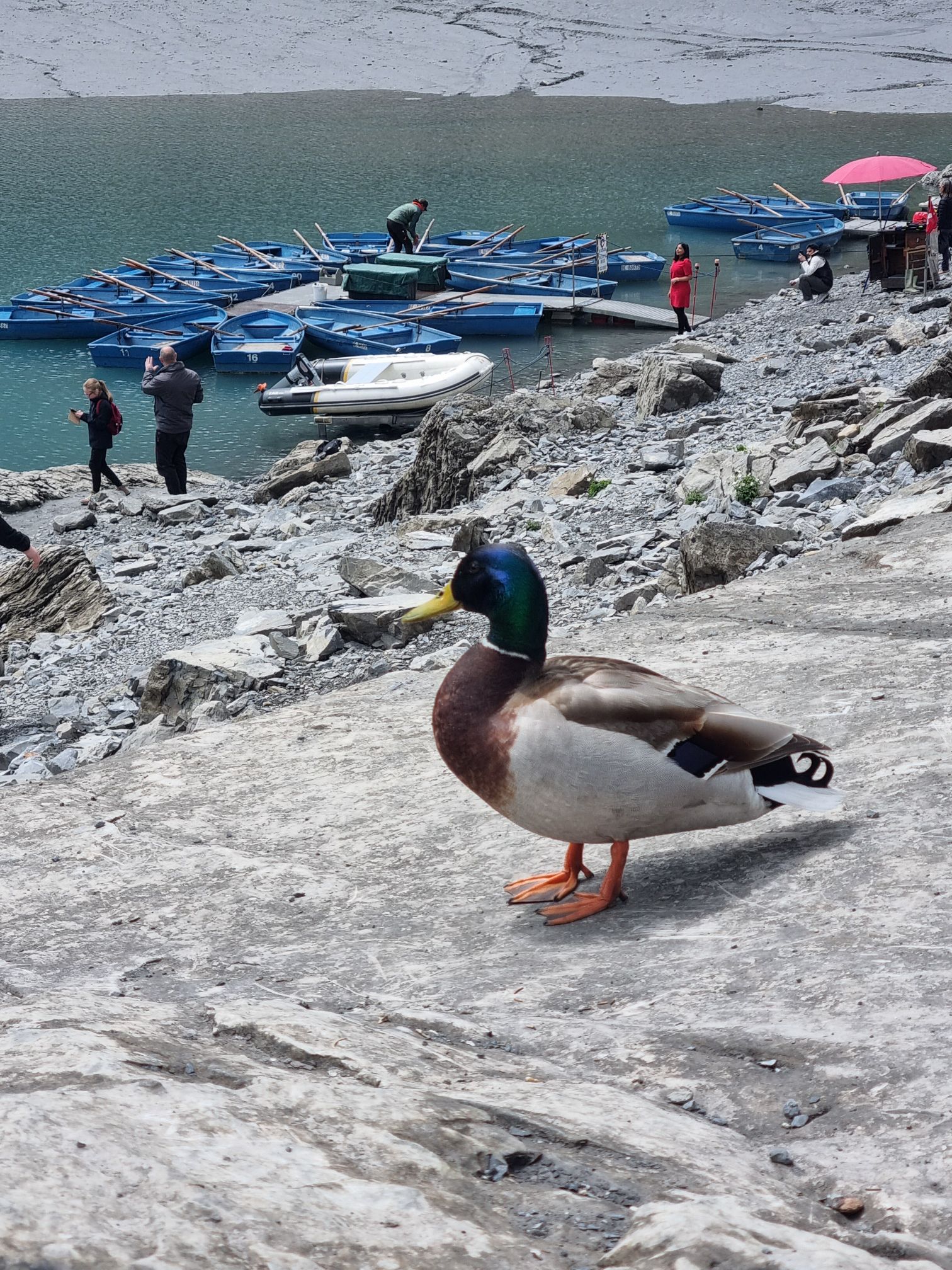 Hinten angekommen mussten wir uns den See erstmal vorstellen, die Wolken waren noch so verhangen und man sah fast nichts. Wir sind dann ins Restaurant und haben kurz noch etwas getrunken. In dieser Zeit hat sich dann die Nebelsuppe immer mehr gelöst und als wieder raus sind, konnte man den See endlich sehen. Wir sind dann zum See runter gelaufen und das Wetter wurde immer besser. Auf einem Stein haben mir es uns so gut es ging gemütlich gemacht und haben was gepicknickt unter der Aufsicht einer Ente. Haben die Aussicht genossen und den Leute etwas zugeschaut, die versucht haben die besten Fotos zumachen.