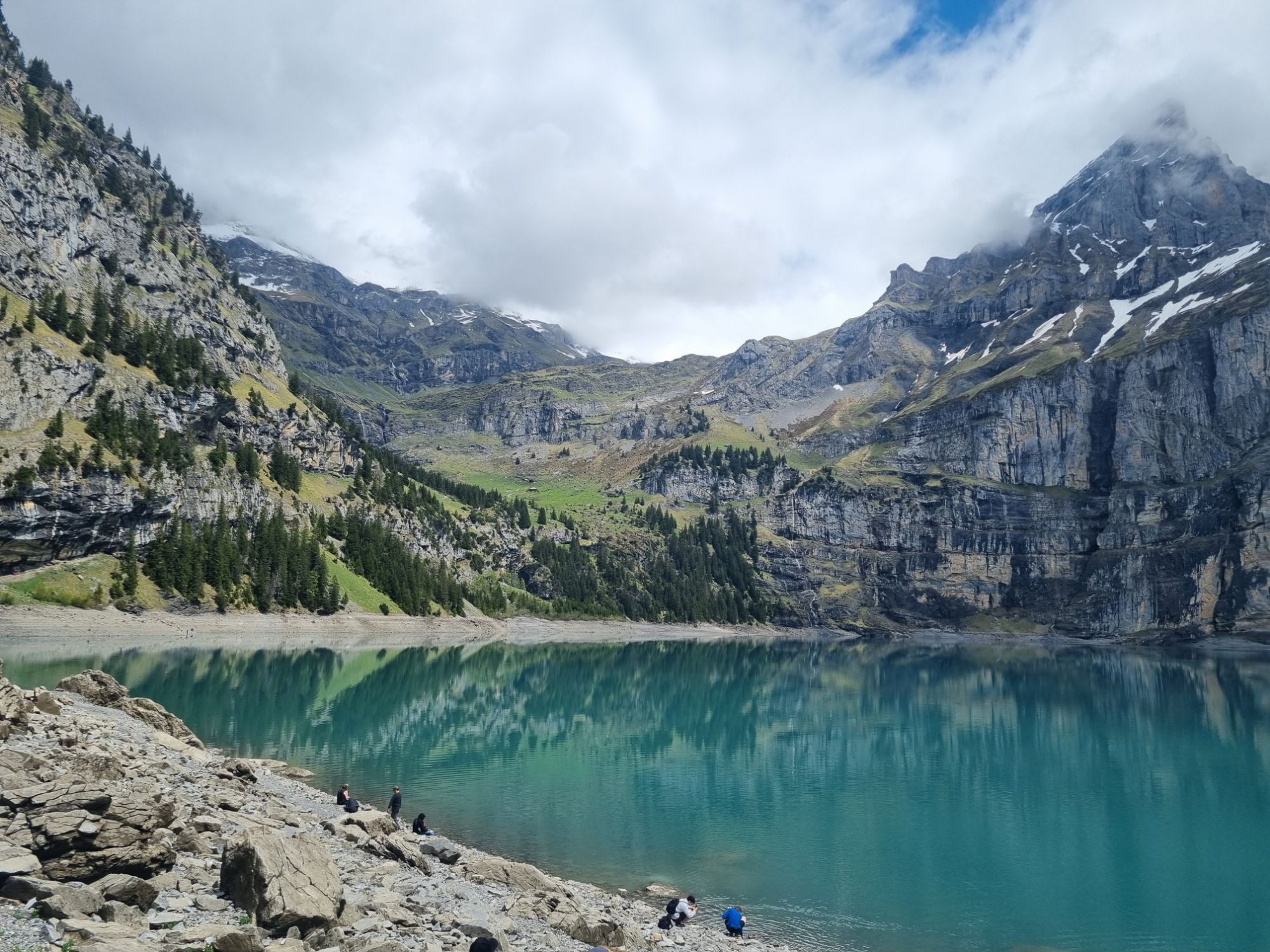 Wir konnten unser Auto direkt beim Hotel stehenlassen und haben uns von dort aus auf den Weg zum Lauenensee gemacht. Es hat immer noch leicht geregnet, sollte aber später besser werden. Es gibt verschiedene Wege, wir hatten uns wohl für den steilsten entschieden und wir mussten dann erst mal einen Weile hinauflaufen. Dann ging es dann aber nur noch schön gerade aus. Bis zur Abzweigung wo man sich entscheiden muss welchen Weg man um den See will. Wir sind nach rechts gegangen, wie wir dann später feststellten, eine gute Idee war. Auf dem Weg hat es dann verschiedene Möglichkeiten zum Picknicken und weiter vorne beim See hat es dann auch eine Grillstelle. Es hat auch ein Restaurant, leider war dies an diesem Tag zu. Wahrscheinlich wegen dem schlechten Wetter. Gut hatten wir was zum Essen und Trinken mitgenommen. Also sind wir dann den anderen Weg zurück um den See, als wir dann eigentlich bei der schönsten Aussicht waren, hat es aufgehört zu regnen. Wir haben dann eine Picknickdecke auf einen Bank gelegt und dort bei schönster Aussicht gepicknickt.