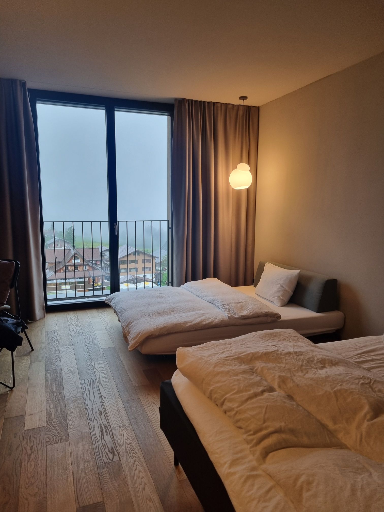 Jedenfalls sind wir dann alles wieder zurück, bei der Stoos Lodge angekommen waren wir bis auf die Knochen nass. Wir haben dann ein schönes grosses Zimmer bekommen, eigentlich mit toller Aussicht, von der wir aber dann nicht so viel hatten wegen der Wolken. Es war ein super Service, dass Zimmer wurde richtig schnell für uns bereit gemacht.