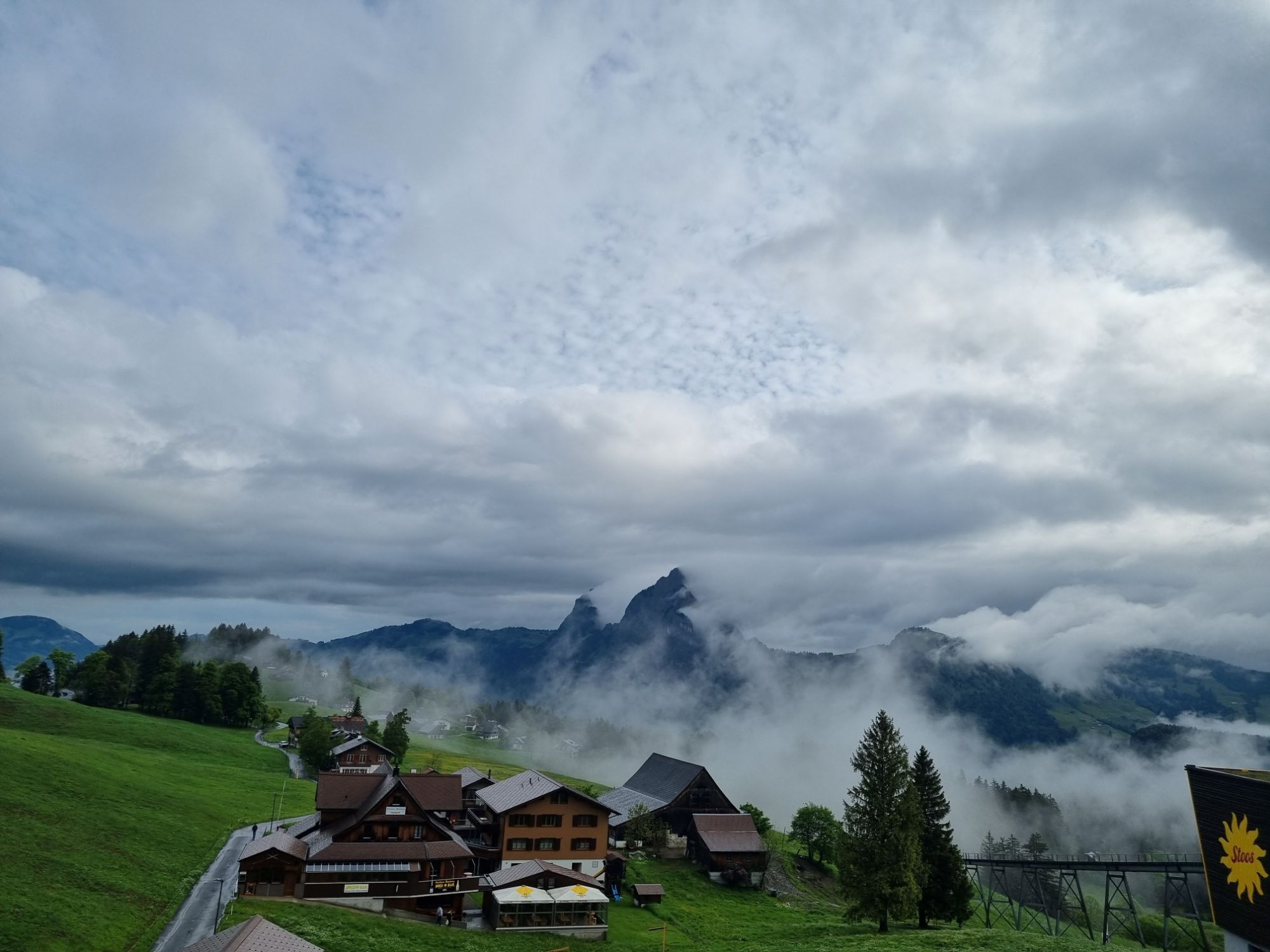 Wir sind über Schwyz hinauf, was auch empfohlen wird. Die Bahn fährt immer 10 und 40. Wir sind mit der 15.10 Bahn hoch und mussten dann noch ca. 10 Minuten zur Sesselbahn laufen. Hätte eigentlich gut gereicht, es hat schon ziemlich geregnet. Dann hat mich das Hotel angerufen, dass die obere Sesselbahn jetzt schliessen muss, wegen zu viel Wind. Wir so ja super und wo sollen wir jetzt hin, er meinte wir sollen in die Stoos Lodge, die sollten noch Zimmer haben. Die beiden Hotels gehören zusammen. Da wir aber schon fast bei der Sesselbahn waren, sind wir doch noch hin und haben gefragt ob wir nicht noch rauf können. Aber er meinte nein ist zu gefährlich, der Wind ist zu stark. Er meinte dann auch er habe am morgen schon Bescheid gegeben oben im Hotel, dass sie an diesem Tag wohl früher schliessen müssen. Man hätte uns also wohl früher informieren können. In diesem Moment war ich wirklich wütend, später als ich mich etwas beruhigt hatte, musste ich sagen wir hätten eh nicht viel von der tollen Aussicher oben gehabt. Sonnenuntergang und auch Sonnenaufgang hätten wir gar nicht gesehen.