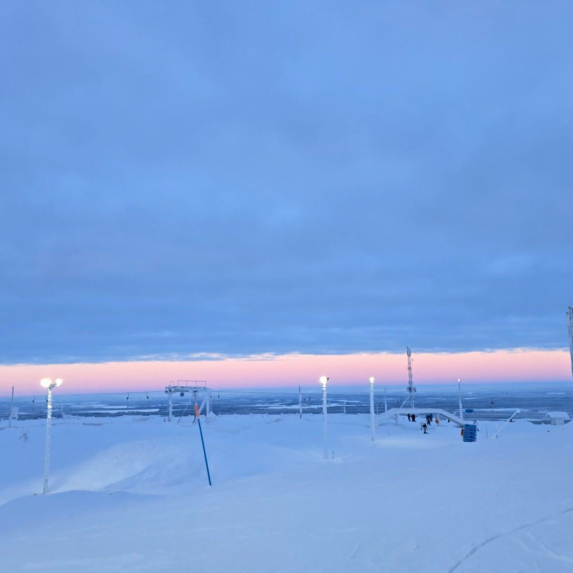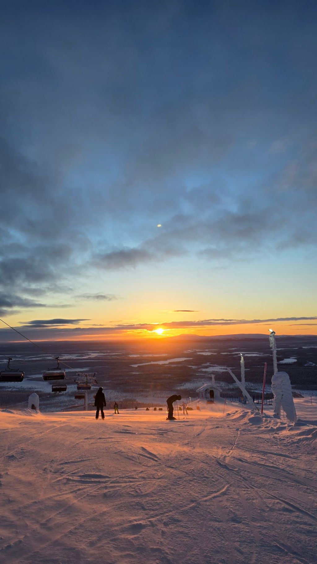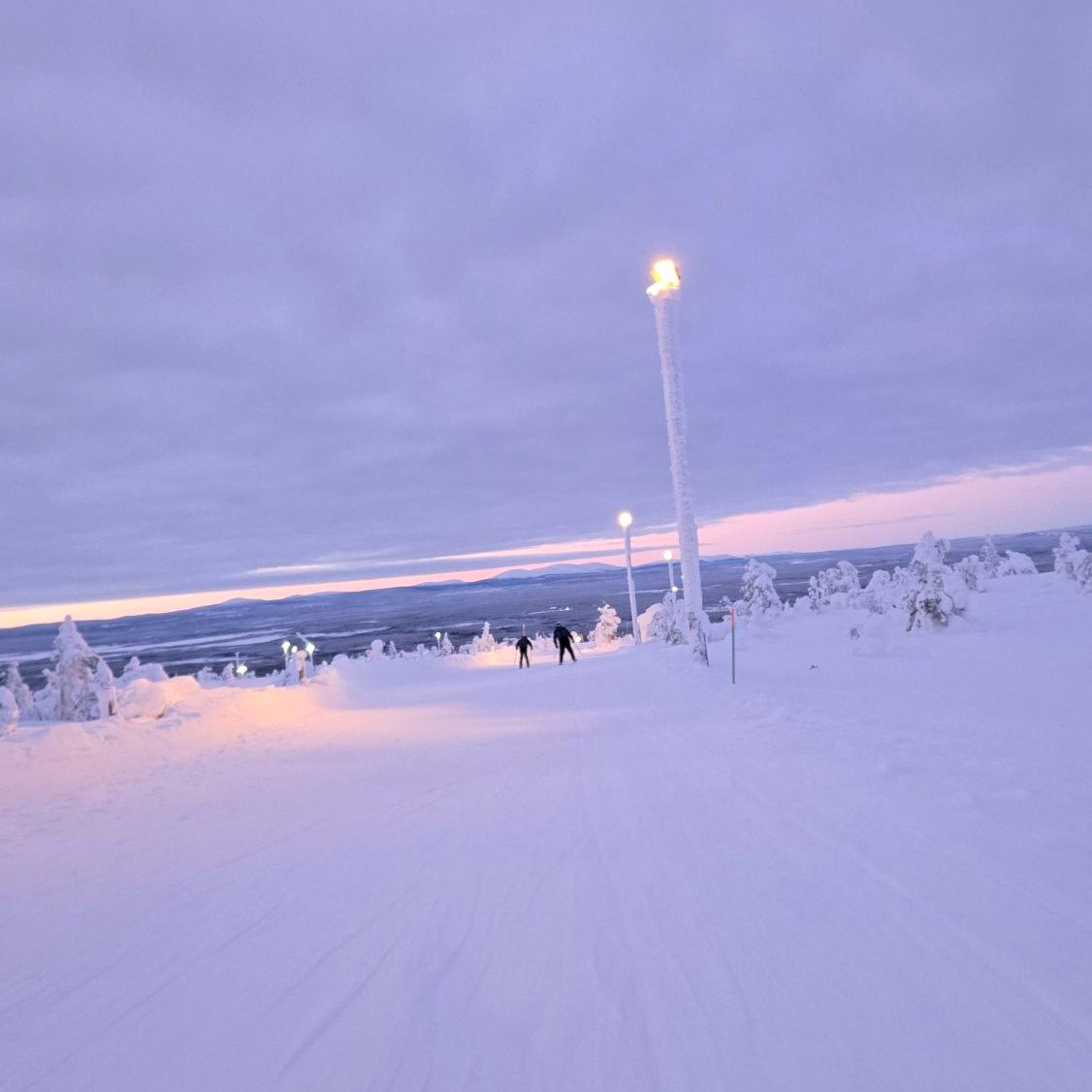 Auf der anderen Bergseite wurde es dann deutlich besser. Wir erlebten einen traumhaften Sonnenuntergang während unserer letzten Abfahrten. Da man in Levi jeweils schnell wieder unten ist, schafft man einige Fahrten hintereinander. Die Stimmung mit dem Licht, dem Schnee und der klaren Luft war einfach wahnsinnig schön.